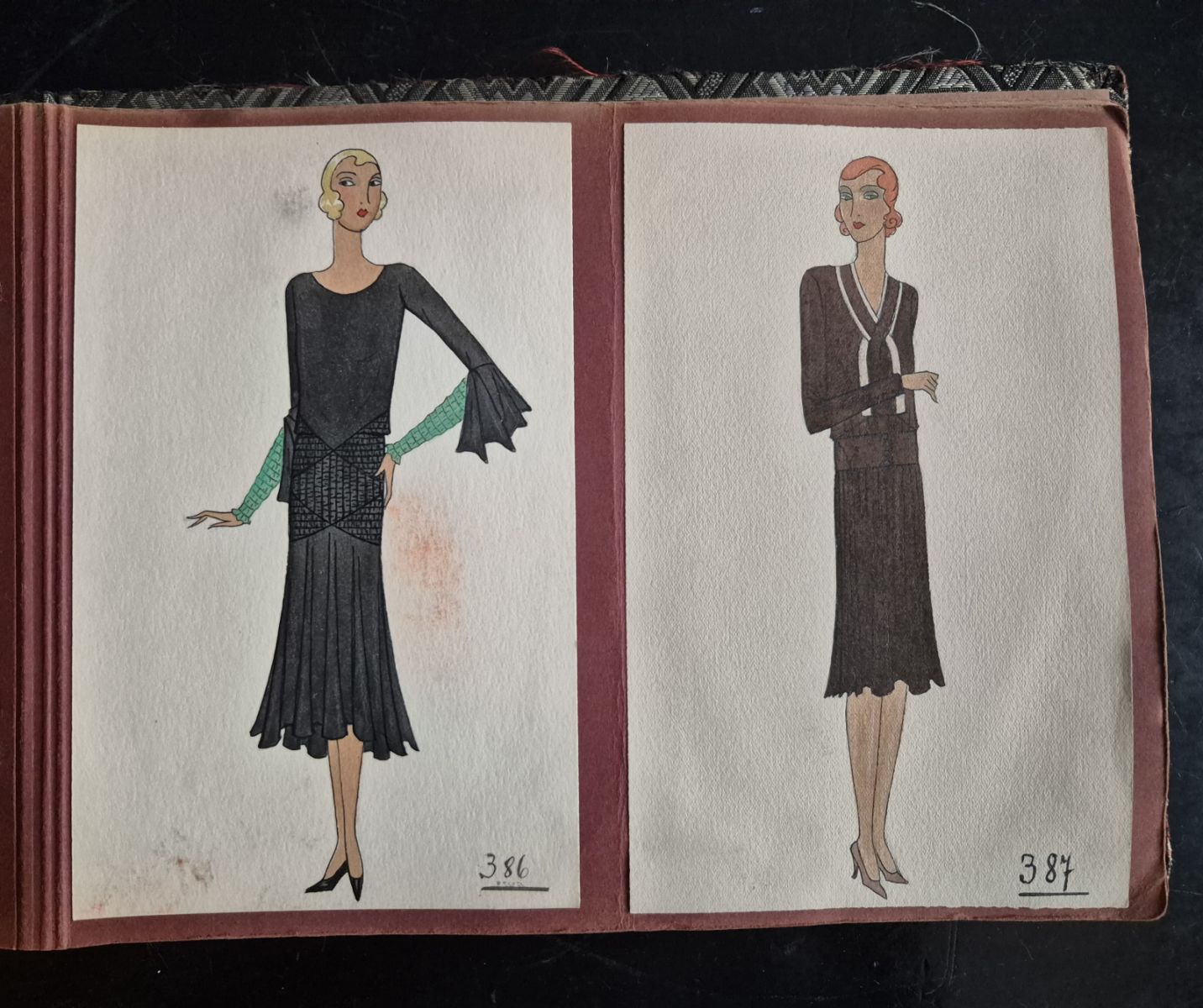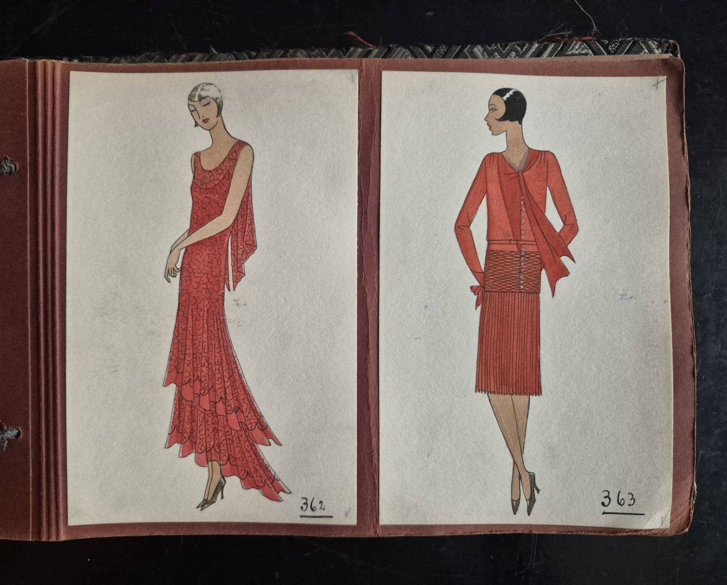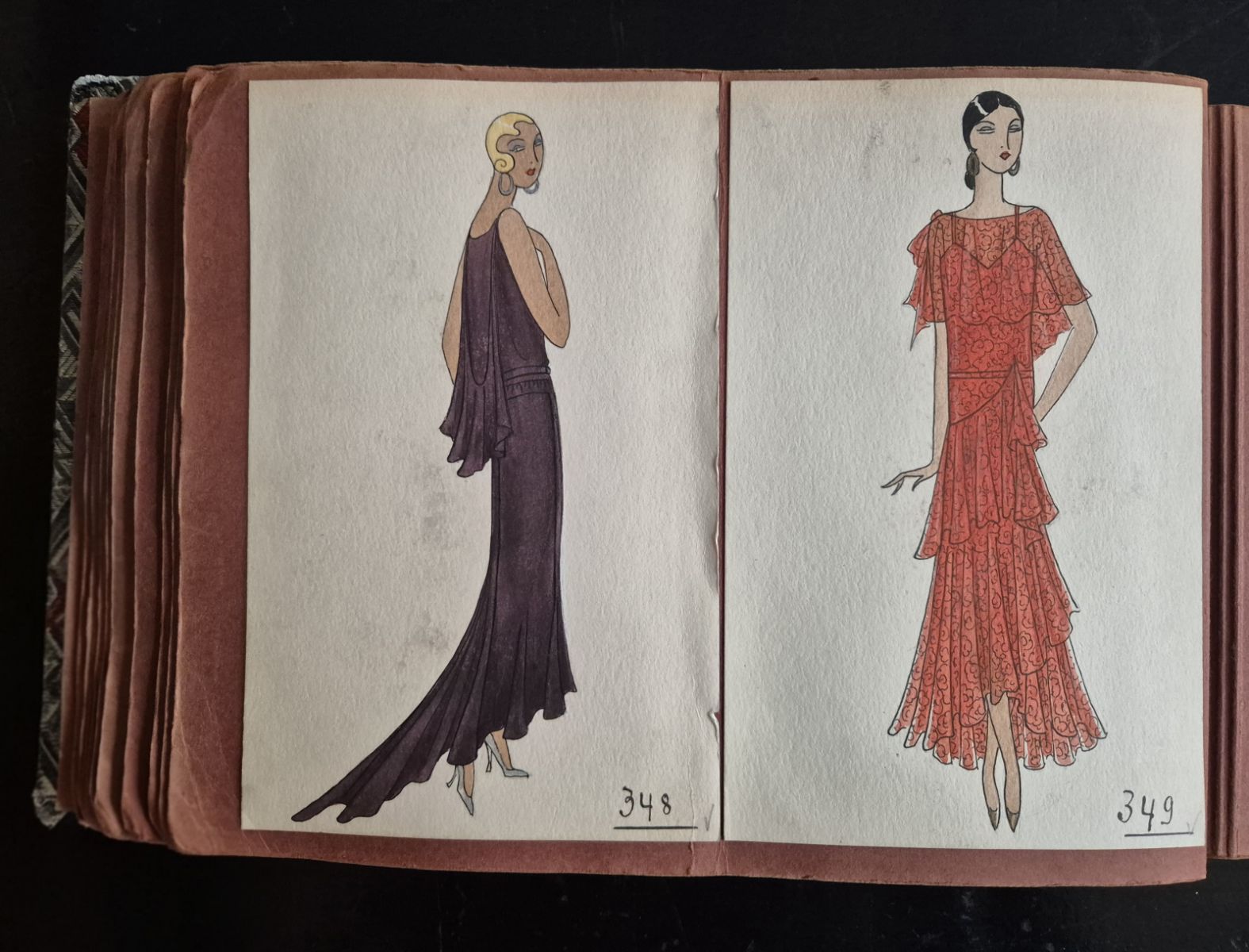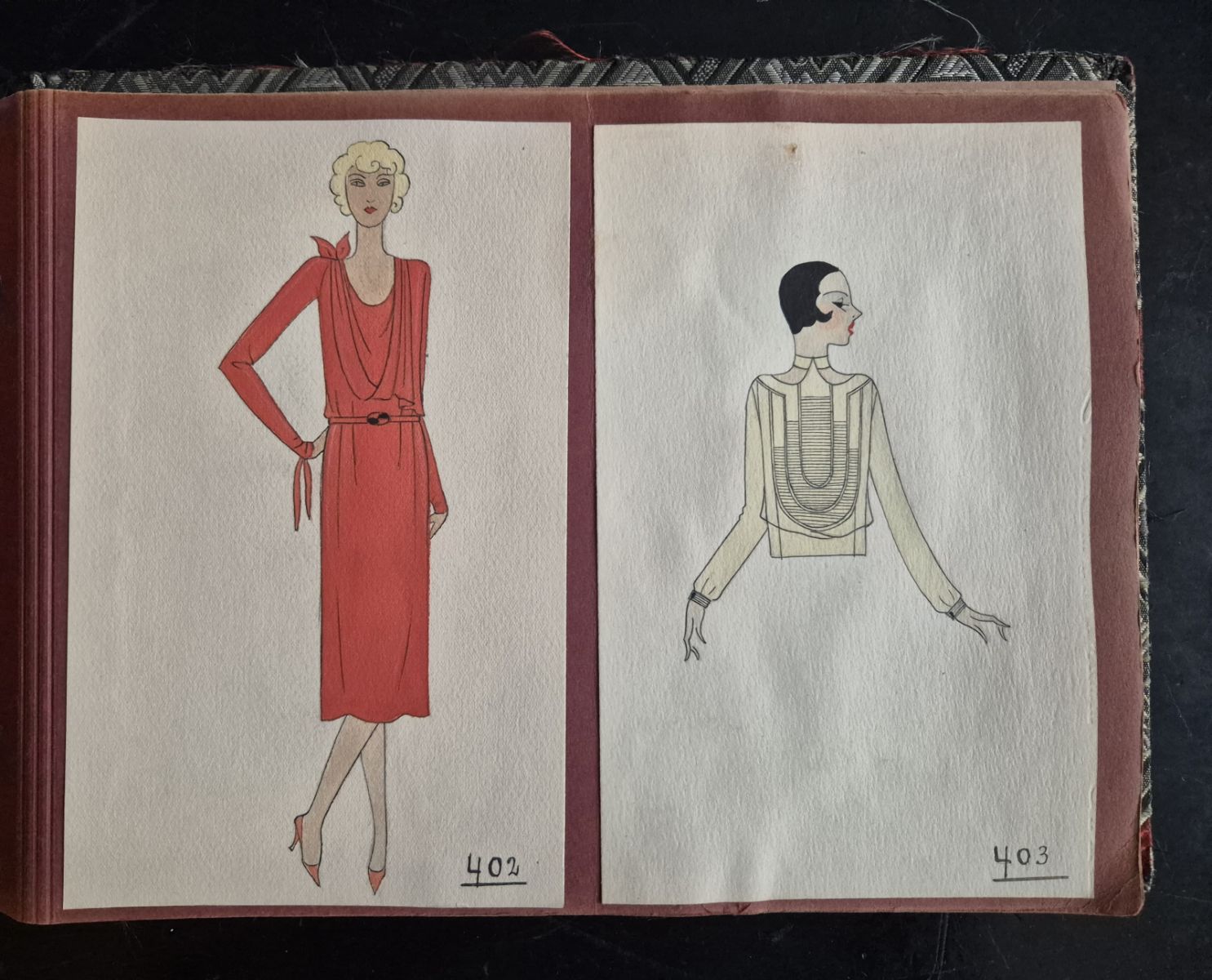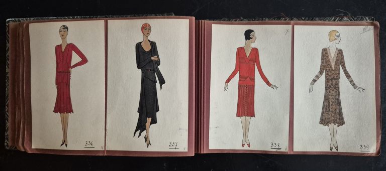 A collection of 93 original dress designs, numbered 310 to 403 (missing number 347). Presumably numbers 1 to 309 presented the previous seasons (Spring, Summer and Autumn 1929).