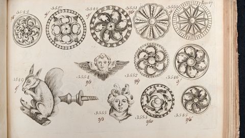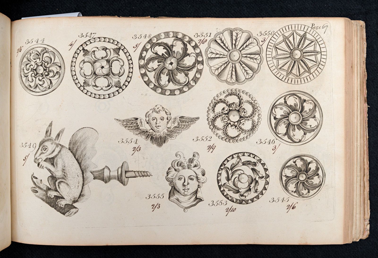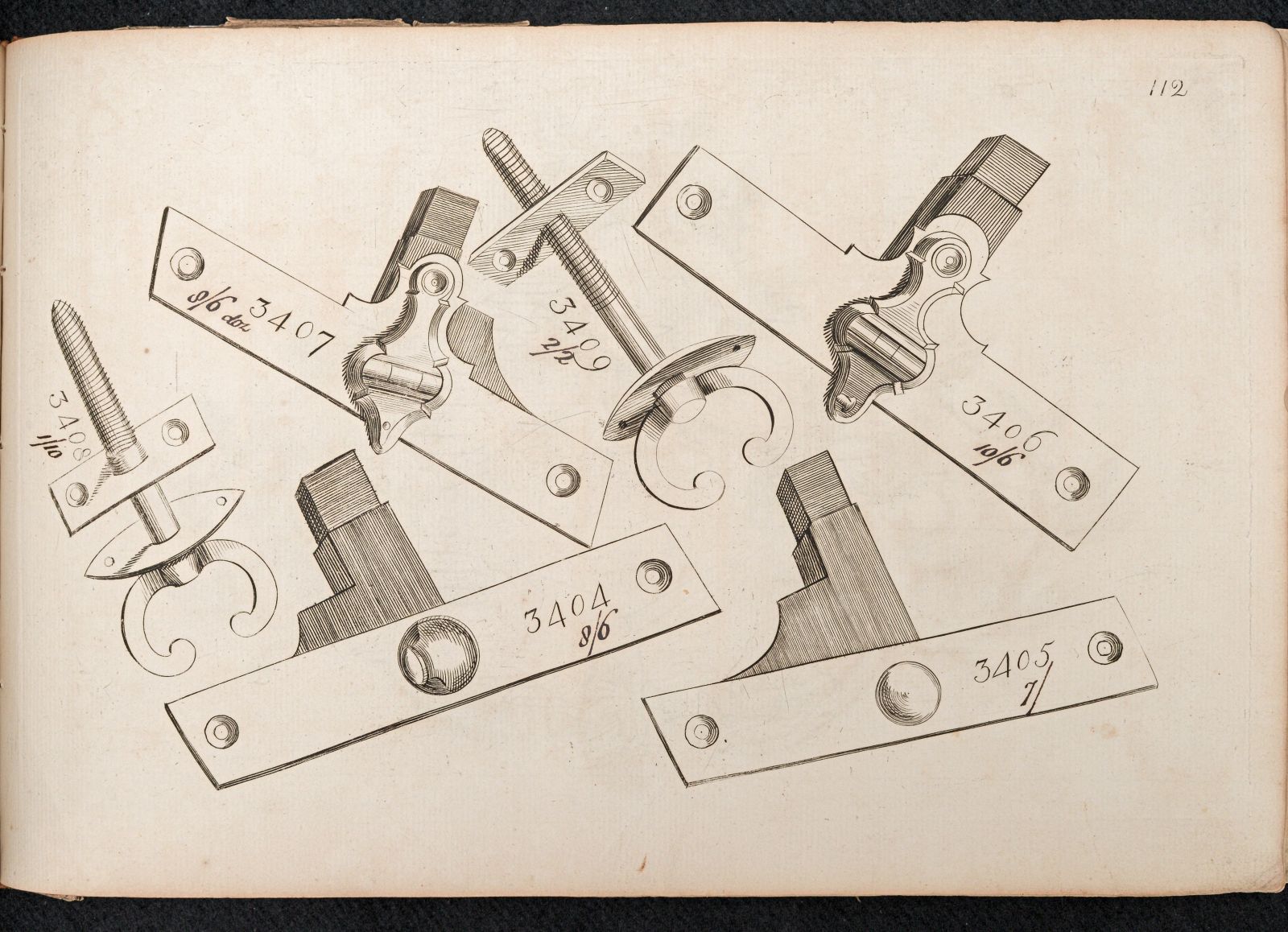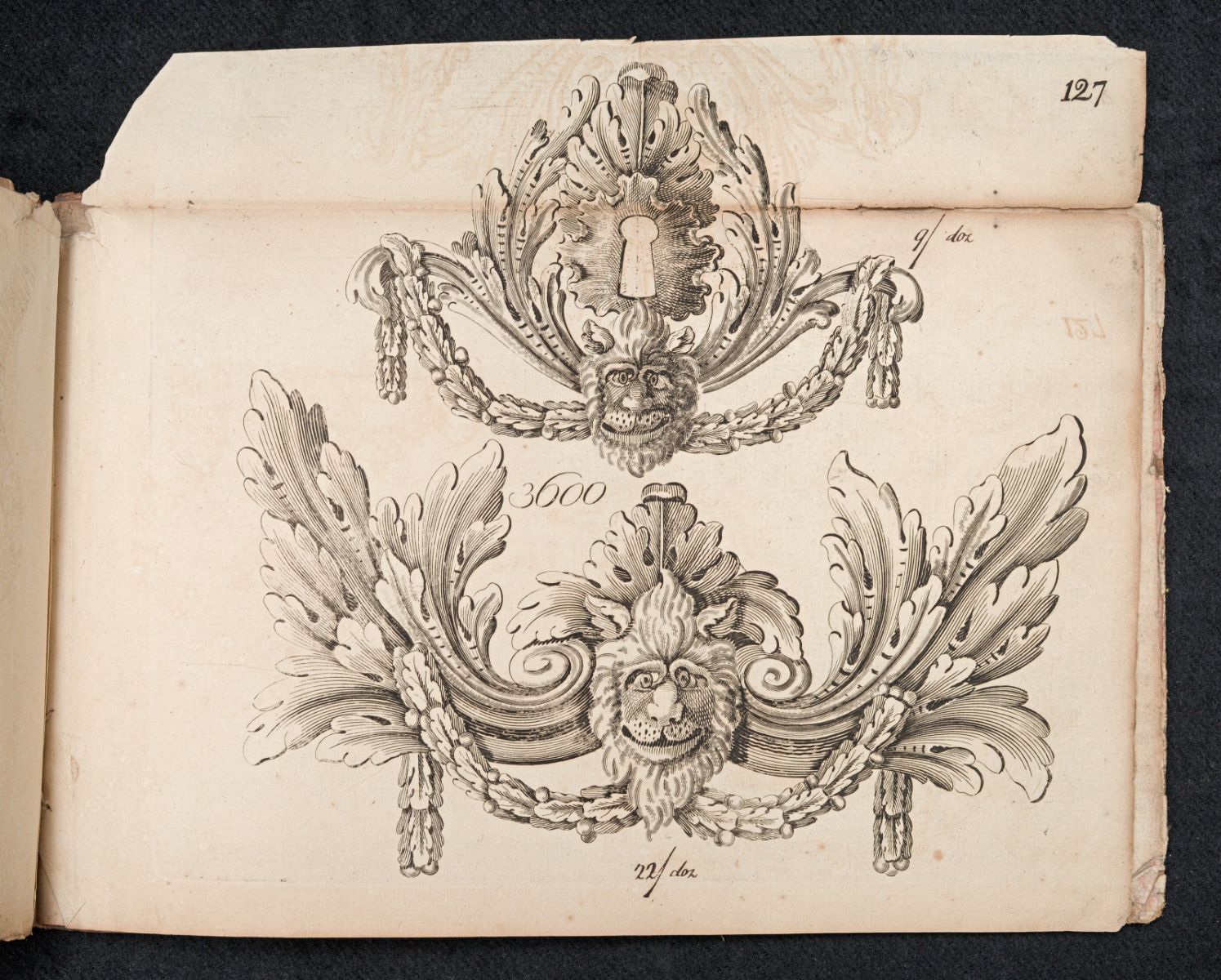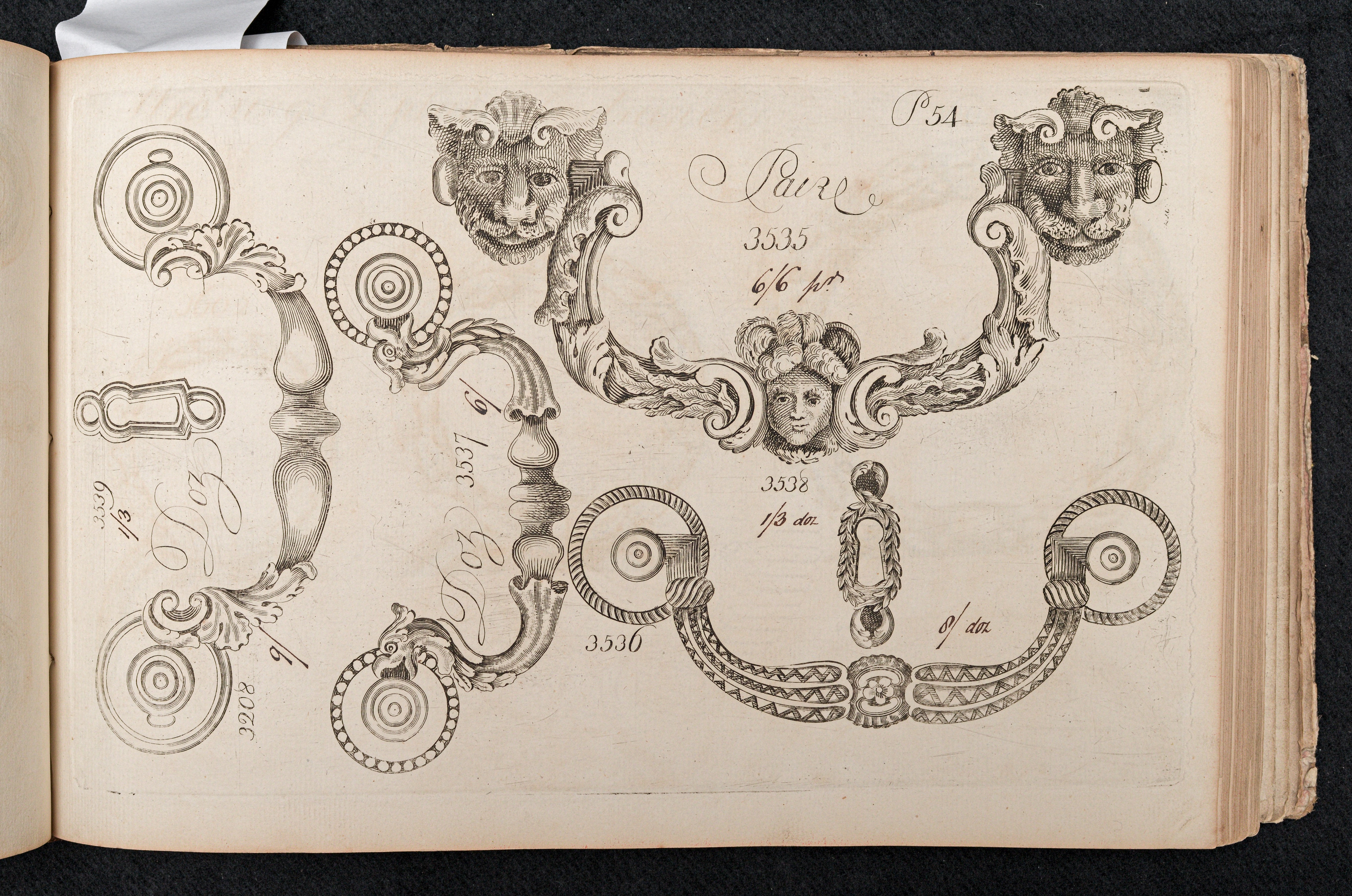 This pattern book is likely the catalogue of an early 19th Century travelling brass founder's agent, illustrating the various types of metal fittings used by furniture makers and related craftsmen. The agent would have been independent, and as a result there is no foundry name but only initials, and the pages are neither consecutive nor of matching format. By preserving the anonymity of the supplier, the agent ensured his monopoly.