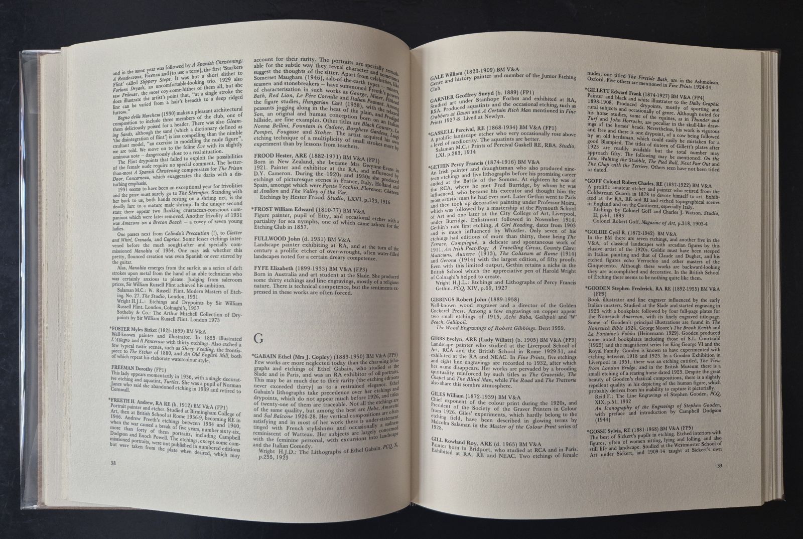 Chronological study of British etchers with an alphabetical list of artists and appendices on the works of Edmund Blampied, Muirhead Bone, C.R.W. Nevinson and Joseph Webb.